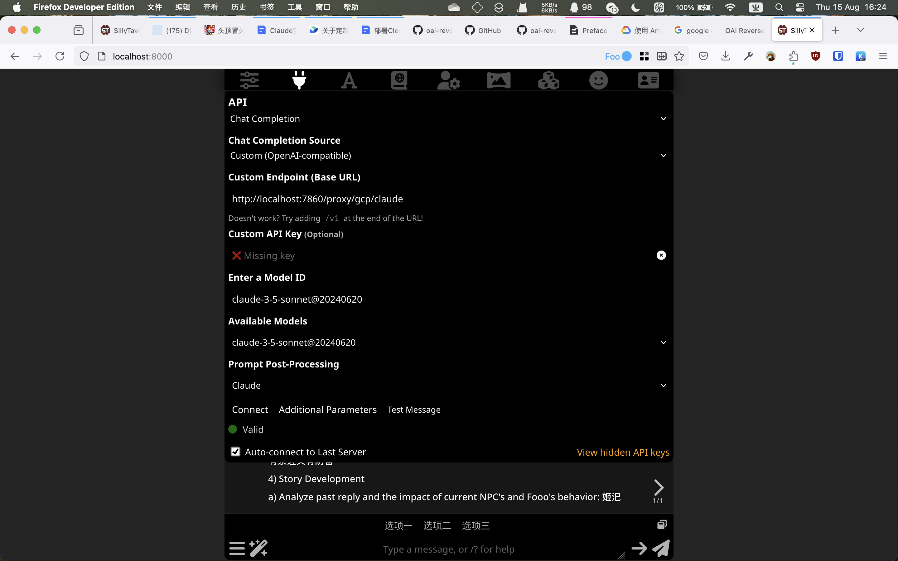 - 假如配置正确,你点击‘连接’的时候,可用模型会显示相应的 Claude 模型。但是测试连接总会成功(oai-reverse-proxy 会在检测到发送的消息是测试消息时不请求API而是直接返回成功),所以最好是直接开始一条对话测试。